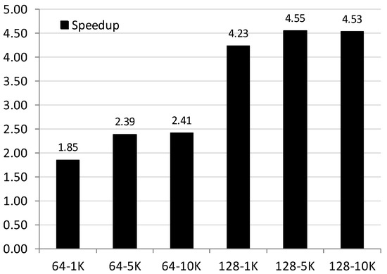 Speedup when comparing CPU and GPU times for Eil76 with respect to different populations (64 and 128) and iterations (1000, 5000, and 10,000).