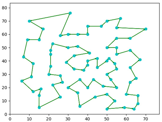 Most of the works related to solving the TSP by means of metaheuristic optimization methods use the ant colony optimization method [24,25,26,27,28], sometimes in a hybrid version with other methods [29]. This is because the natural behavior of ants in the development of a colony can be easily matched to the problem of finding the shortest path between a series of nodes.