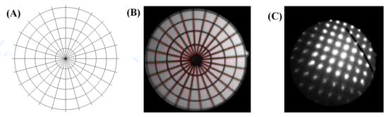 The data for evaluation of central angle measurement: (A) the custom-designed grid, (B) segmented radial lines, and (C) an example of a line segment with the projected laser points.