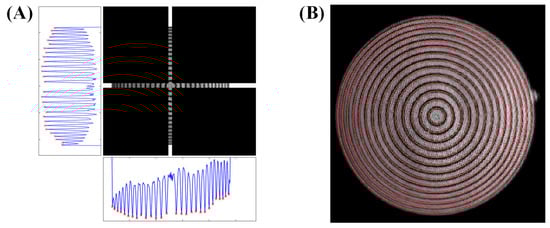 To demonstrate this, a circular grid with the spacing of 0.5 mm was recorded at working distances of 2.87 mm and 2.24 mm. Figure 2 shows the recorded images. The circles had a constant distance of 0.5 mm from each other. However, in Figure 2A we see as we go from the center toward the periphery the distance between consecutive circles decreases from 30 pixels to 20 pixels. This clearly demonstrates the dependence of horizontal measurements on the spatial location. Comparing Figure 2A,B we see the effect of working distance, where the distance between the two smallest circles increases from 30 pixels to 35.5 pixels when the working distance decreases from 2.87 mm (Figure 2A) to 2.24 mm (Figure 2B).