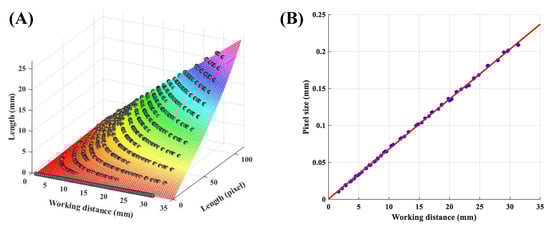 The uniform pixel size was computed for all recordings in Set 1. Then, a statistical model was trained using the working distance as the predictor variable and as the outcome variable. Investigating the relationship between working distance and revealed a linear model. This model is shown in Figure 5B and it will be referred to as the uniform model in the rest of this paper.
