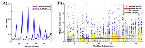 This experiment was based on Set 2. The accuracy of the improved vertical measurement model (Equations (16) and (17)) was compared with the original method [] using 10-fold cross-validation. The original method used the value of 30° for the standard angle. At this angle, the grid becomes a square that is parallel to the x- and y- axes, which facilitates the labeling of the laser points. The same standard angle was also used for the proposed improved version. Recordings from Set 2 were split into training and testing sets. Both models were trained using the training set. The trained models were then applied to the testing set and measurement errors were computed. First, the effect of different laser points on the error was investigated. MAE was computed for each laser point averaged over all working distances. Figure 8A shows the result. Based on this figure we see different laser points exhibit different performances in the original method, where the top-row laser points (refer to Figure 7A) produce inferior results. Conversely, all laser points exhibit comparable performances in the improved PCA method. A second analysis was conducted to test the effect of working distance on the accuracy of both methods. For this analysis, the magnitude (i.e., absolute value) of error from laser points at different working distances were computed. Additionally, laser points from the top row were discarded from the original method and only the remaining 42 laser points were used. However, all 49 laser points were used for the analysis of the improved PCA method. Figure 8B shows the results. The lines represent the linear model fitted on the individual data points. We can use the slope of regression lines to compare the dependence of the magnitude of error of different methods on the working distance. Slopes of original and PCA methods were 0.008 and 0.001 mm/mm, respectively. Therefore, we may conclude that the performance of the improved PCA method is less dependent on the working distance.