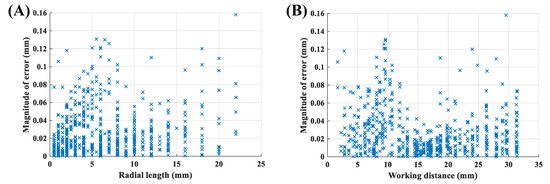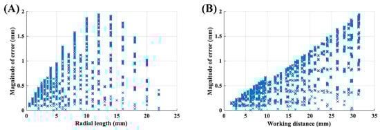 The non-uniform model was trained using the training set, and then its performance for estimating the mm radii of circles was evaluated using the testing set. Figure 10 presents scatter plots of the magnitude of errors over all 10 folds relative to the radial length of the target circle and the working distance.
