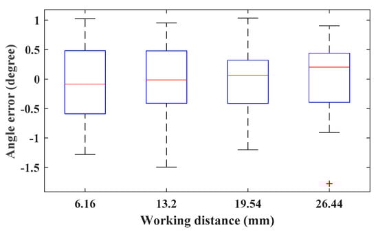 This experiment was based on Set 3. Equation (8) is at the core of general calibrated measurements using the non-uniform model and relies on the angle α. Experiment 3 was conducted to investigate the accuracy of the estimation of α from an image. This experiment is especially important, given the presence of non-linear distortion in flexible endoscopy []. Angle differences between adjacent lines from Set 3 (Figure 3) were estimated, and then they were subtracted from their true value (i.e., 15°). Figure 11 presents boxplots of this error for different working distances. Running a one-way analysis of variance (ANOVA) did not indicate any significant effect of working distance. Therefore, all measurement errors were combined into a single group. The overall angle estimation error had the value of −0.03° ± 0.6° (average ± std). Consequently, central angles can accurately be estimated from acquired images. This result may seem contradictory with a previous finding, suggesting significant errors in the estimation of angles from flexible endoscopes [], and hence requires further explanation. The proposed method relies on central angles; however, the work of [] was based on a general angle. Considering the radial nature of the non-linear distortion, lines passing through the center do not experience bending and curving. Therefore, the central angles can be measured very accurately.