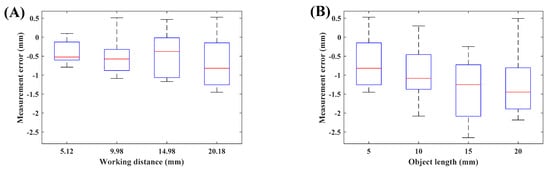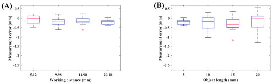To investigate the effect of working distance on general horizontal measurement in the uniform model, measurement errors from a 5 mm line segment recorded at working distances of 5.12, 9.98, 14.98, and 20.18 mm were computed. One-way ANOVA with a trimming level of 0.2 and 1000 bootstrap samples [] was non-significant (p = 0.61). Figure 12A presents boxplot of errors for different working distances. To investigate the effect of length of the target object on general horizontal measurement in the uniform model, measurement errors from 5, 10, 15, and 20 mm line segments recorded at the working distance of 20.18 mm were computed. One-way ANOVA with a trimming level of 0.2 and 1000 bootstrap samples [] was non-significant (p = 0.22). Figure 12B presents boxplot of errors for target objects with different lengths. Considering these non-significant results, all measurement errors were combined into a single group. The overall measurement error was −0.8 ± 0.69 mm, and the magnitude of error was 0.86 ± 0.6 mm for the uniform method.