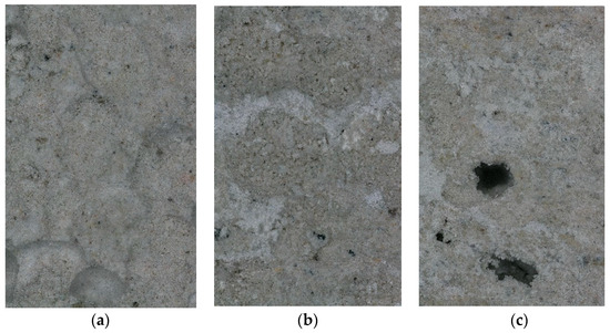 A 200× magnified microstructure of the autoclaved aerated concrete (AAC) samples: (a) AC-4; (b) AC-5; (c) AC-6.