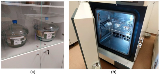 (a) Rack with desiccators in an airconditioned room; (b) samples in an environmental chamber.