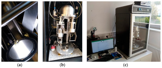 (a) Sample pan with a sample in the chamber; (b) detail of dynamic vapor sorption (DVS) manifold; (c) DVS device with computer.