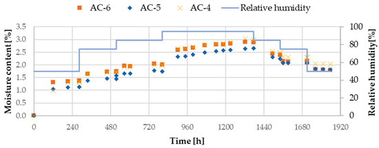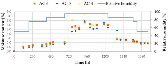 Figure 9 shows the results for the AC-5 sample measurements. Most of the results show identical tendencies, and the envelope of sorption and desorption in the region of 50 to 85% relative humidity approximately copies the tendencies observed performing with conventional methods. The most significant deviations are similar to the AC-4 samples in the area of high relative humidity. The values of the samples from the environmental chamber are distorted at the last point by the influence of the moisture condensation accumulated in the chamber.