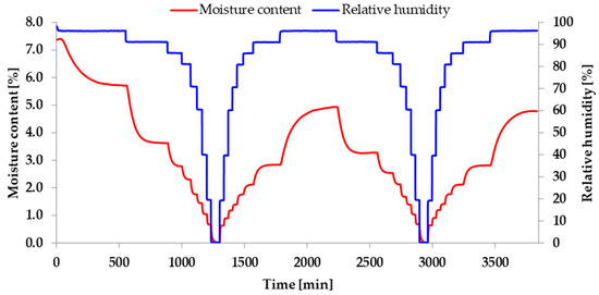 The individual points on the curve used the DMDT criterion. For relative humidity points up to 80%, the DMDT derivation value was set to 0.0005%/min as a criterion for reaching the steady state. The criterium value for humidity from an 80% relative humidity was lower (0.0002%/min) to achieve a higher accuracy. The DMDT criterion has the advantage of saving a measurement cycle time at a low relative humidity, where rapid stabilization occurs. The DMDT criterion monitors the change in the weight of the sample over time. However, there is a risk of a slower sorption response of the material, which would distort the result at a higher humidity region. Only a small change in relative humidity will start to show after more than a 20 min interval time at high levels. Thus, with short stability intervals, the incorrect weight may be considered stable and the method would proceed to the next point. Such an example can be seen in Figure 4. It may happen that after reducing the relative humidity from 95% to 90%, the weight of the sample still does not decrease significantly enough for some time and the DMDT value practically does not change. Therefore, this state is considered to be steady and thus the equilibrium point at a 90% relative humidity can acquire the same or even higher equilibrium humidity value than the sorption point at a 95% relative humidity; but, this is not practically possible.