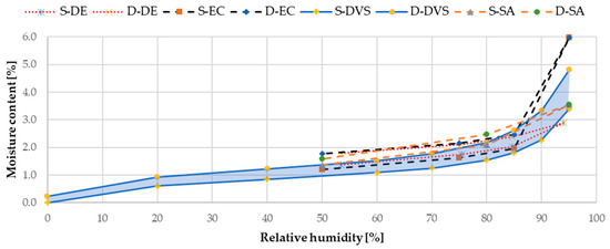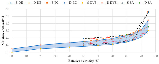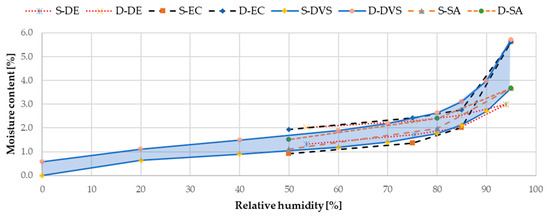 The analysis and comparison of the individual methods are based on the data measured by each method. Figure 8, Figure 9 and Figure 10 show the averaged values of the equilibrium points forming the sorption and desorption isotherms. The measurement results reached applying the DVS method were projected onto the graph in the form of envelope curves. They are formed by lines connecting the minimum and maximum values of all the performed measurements. The area between the curves is highlighted blue and it determines the possible equilibrium states of the material. Data obtained using the conventional methods were projected onto the same graph in contrast to the results of the dynamic sorption method. The results obtained applying individual methods are approximately identical and with same tendencies. They differ significantly in the endpoints, representing the maximum value. In the legend, the sorption curves are denoted by the prefix S, and the desorption curves are denoted by the prefix D. The results obtained from the desiccators with salt solutions are denoted by the suffix DE. The suffix EC indicates the results obtained from the environmental chamber. The DVS system uses the DVS suffix for its results and the desiccators with sulfuric acid solutions use the SA suffix.