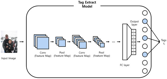 First, in our proposed method, tags are created for image objects using a CNN model. In particular, we used the ResNet-101 model [16] as the state-of-the-art (SOTA) CNN model for image tagging because it uses skip-connection techniques and has effective performance on ImageNet. The process for image tagging using ResNet-101 is as follows. First, the CNN model extracts the features of images using a filter and then stores them in various feature maps. The fully connected (FC) layer uses a value projected by the number of each class (tags) from each layer to classify the final image of the extracted feature map. In the output layer, the predicted value of the image tag is output using the Sigmoid activation function, shown in Equation (1) below: