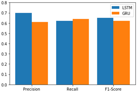 The result of predicting the predicate using the <Subject, Object> pair after extracting the tag using the CNN is shown in Figure 6. In the case of the LSTM model, the learning rate was 0.005, the embedding size was 300, the hidden size was 128 and the num layer was set to 1. The test was conducted by setting the prediction of each relation such that it exceeded.05 probability when passing through the Sigmoid activation function during relation prediction. Precision, recall and F1-Score were used as evaluation criteria. We found that the proposed LSTM method had higher precision than the GRU method, as shown in Figure 6. Although the recall of the proposed method was lower than that of the GRU, its F1-Score was higher.