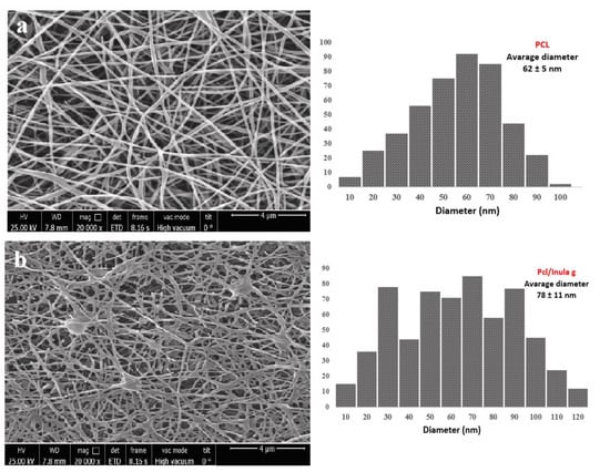This study concerned the development of I. graveolens/PCL nanofibrous scaffolds using an electrospinning technique. The scaffolding conditions are improved by adjusting the electrospinning parameters, which include the needle measurement, the collector, the voltage, and the pumped polymer quantity. After optimization of conditions [24], bead-free fibers with a minimum diameter were obtained. To that end, the needle’s distance to the collector was 20 cm, the voltage was 8 kV, and the polymer flow was 0.5 mL/h, and a blend of 8% PCL and 5% I. graveolens were found to be suitable. The polymeric materials, becoming smaller in scale with a large surface area to volume ratio, can provide the plant extracts with improved properties such as chemical and antimicrobial activity [25]. The major benefit of plant scaffolding is the obvious simplicity with which it can be produced and handled; the design of a variety of sizes and shapes is entirely foldable, easy to cut, shaped, rolled, or stacked. They can also be reused, are easy to use, and are relatively cheap [26]. The principle of plant material Electrospun comprising therapeutic characteristics especially wound healing on the polymer matrix, is impressive. In Figure 1, the SEM micrographs of PCL Electrospun nanofibers and I. graveolens/PCL nanofibers showed that nano-scaled fibrous structures without beads were present. It was acquired under the controlled spinning conditions used in this research. The scaffold nanofibers derived from the I. graveolens/PCL combination were illustrated with micrographs of the SEM in Figure 1. As seen in the pictures, the fiber diameter decreases when natural polymers are increased. Fiber diameters were 72 ± 963 nm in the PCL/I. graveolens ratio 70/30 (V:V). In a similar study, Suryamathi and his coworkers reported that the average fiber diameter of PCL nanofibers was increased with the encapsulation of Tridax Procumbens Extract [27]. A natural I. graveolens polymer is also a polyelectrolyte polymer, which can release ionic groups such as carboxyl groups in the solution. The addition of anionic and cationic polyelectrolytes increases the electric conductance of the solution of electrospinning [28].