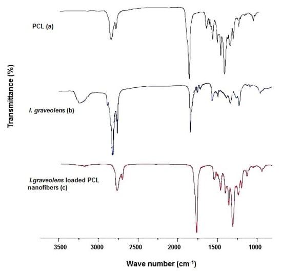 FTIR spectrum of PCL (a), I. graveolens (b), and (c) I.graveolens loaded PCL nanofibers.