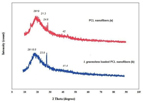 For XRD measurements, for PCL nanofibers and I. graveolens extract, loaded PCL nanofibers were obtained using Philips apparatus at an angle of (2θ) around 10° and 80°, with Cu as a reference at wavelengths of 1.5406 Å (λ).