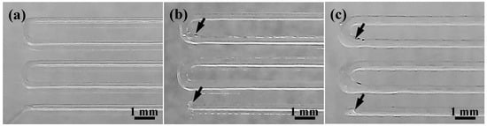 The printed results from the self-fabricated 3D bioprinting system using the combinations of 3BE-2 with (a) Φ 0.13 mm, (b) Φ 0.33 mm, and (c) Φ 0.9 mm needle head.