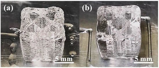 The 3D cubic-like constructs were printed through the self-fabricated 3D bioprinting system: (a) 3BE-2 combined with Φ 0.13 mm needle head and (b) 3BE-3 combined with Φ 0.13 mm needle head. The shape of the printed structure can be maintained for over 24 h using the combinations of 3BE-3.
