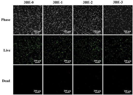 Furthermore, we also compiled the preliminary experiment to study the viability of L929 fibroblasts combined with 3BE hydrogel within the printing process. It was found that more cell death was present 24 h post-printing. The decrease of cell viability after printing is the commonly encountered issues in 3D bioprinting application []. This might be caused by the pressure used to expel the bioink in microextrusion bioprinting []. Printing at higher extrusion pressures will increase the number of dead cells since a higher pressure will elevate the shear stress in the nozzle, which eventually damages the cell membrane and leads to lower cell viability after extrusion [,]. A previously published study demonstrated an inverse relationship between extrusion pressure and cellular viability, especially in high extrusion pressures []. In addition, hydrogel concentrations can be another issue to affect cell viability after printing. One study found that a higher concentration of hydrogel showed the fastest decrease in metabolic activity of the cell compared to the low concentration group in long term observation [].