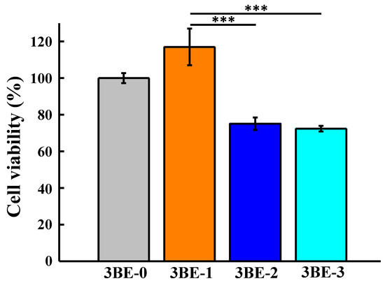 3-(3,4-dimethylthiazol-2-yl)-2,5-diphenyltetrazoliium bromide (MTT) analysis for quantitative measurement of cell viability in different concentrations of the 3BE before bioprinting. The bar chart showed cell viability of L929 fibroblasts in each group was higher than 70%. The sample is considered an acute cytotoxic potential when viability value of the sample is reduced to < 70% of the blank according to ISO 109993-5. (***p < 0.001).