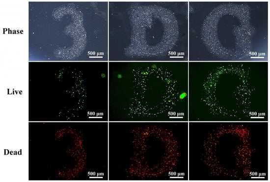 For quantification, the cell viability evaluation was carried out by 3-(3,4-dimethylthiazol-2-yl)-2,5-diphenyltetrazoliium bromide (MTT) assay. After 24 h of culture, the MTT solution (5 mg/mL) was prepared in PBS and filter sterilized. The 3BE was removed and 100 μL of MTT solution was added to each well. The cells were incubated for 5 h in 5% CO2 incubator at 37 °C, during this time, the conversion of MTT resulted in purple formazan crystals. After 5 h, MTT solution was removed and 100 μL of dimethyl sulfoxide (DMSO; Sigma, Taipei, Taiwan) was added. The absorbance was measured using microplate reader (BioTek Epoch, Winooski, VT, USA) at 570 nm. The assay was performed in standard 96-well plates and each experiment was performed with nine repeats (n = 9). The results were represented as the percentage of cell viability (based on the optical density values from MTT assay).