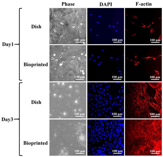 After one day and three days of culture period, the cells in the printed samples were stained with F-Actin and 4,6-diamidino-2-phenylindole (DAPI) respectively. Shortly, samples were fixed in 4% (w/v) paraformaldehyde for 15 min, afterwards soaked in 0.1% (v/v) Triton X-100 in PBS for 30 min, then blocked with 1% (w/v) bovine serum albumin (BSA) in PBS for 1 h at 37 °C. Then, for F-actin staining, samples were soaked in 1:40 dilution of Alexa Fluor 594-phalloidin in 0.1% (w/v) BSA for 45 min at 25 °C. After washing with PBS, the samples were incubated with Alexa Fluor 488 goat anti-rabbit secondary antibodies (1:200) for 1 h at 37 °C. Eventually, the nuclei were stained with DAPI (1:1000) for 5 min at 37 °C. All antibodies were diluted with 0.1% (w/v) BSA. To observe the cells in the final samples, an Olympus IX71 fluorescence microscope was used.