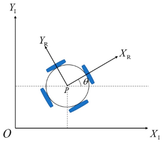 where , as shown in Figure 2, is the distance between every Mecanum wheel and the point , and is the radius of the Mecanum wheel.