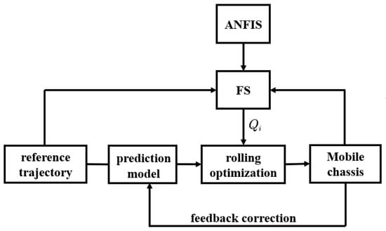 Predictive control is a novel type of control algorithm in the field of industrial process control. It is not only a representative advanced control algorithm but also a theoretical system of stability and robust design of uncertain systems with rolling optimization characteristics []. In [], a MPC strategy for non-holonomic constrained wheeled mobile robot (WMR) is put forward. The kinematic model of the WMR is linearized. According to the constraints of the status and input, WMR control law can achieve optimal control. In [,,,], MPC applied to an omni-directional wheeled chassis is introduced. MPC can realize accurate control of complex paths. Nevertheless, some parameters of MPC need to be manually adjusted, which is time-consuming and labor-intensive. If the tuning is inaccurate, it is difficult to achieve optimal path tracking. Thus, there is more research and development required n the direction of adaptive tuning. In [], an adaptive fuzzy nonlinear model predictive control (FNMPC) strategy for trajectory tracking of the WMR is proposed. An adaptive fuzzy system is obtained through training and applied to the approximation of the WMR model. The parameters of the fuzzy model are adjusted online by using the gradient descent algorithm, which can minimize the tracking error of a given trajectory. In [], an improved MPC strategy is designed. The improved MPC also can adaptively adjust the weight of the cost function through fuzzy control, and it is superior to a traditional MPC in terms of tracking accuracy and steering stability. However, operators need to summarize a complete set of fuzzy control rules through a large amount of practical experience. If the fuzzy system is simple or wrong, it may lead to the reduction of control accuracy, even the deterioration of dynamic quality. Therefore, it is more difficult to build complete fuzzy rules.