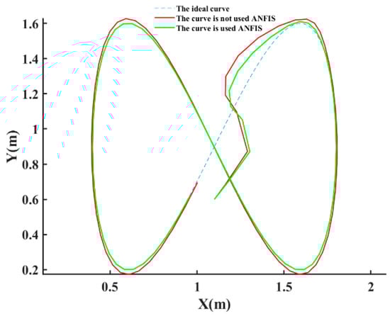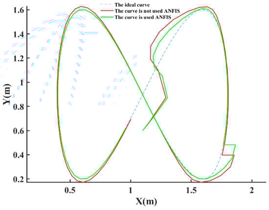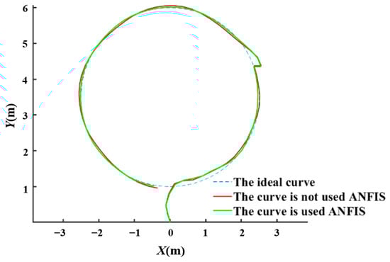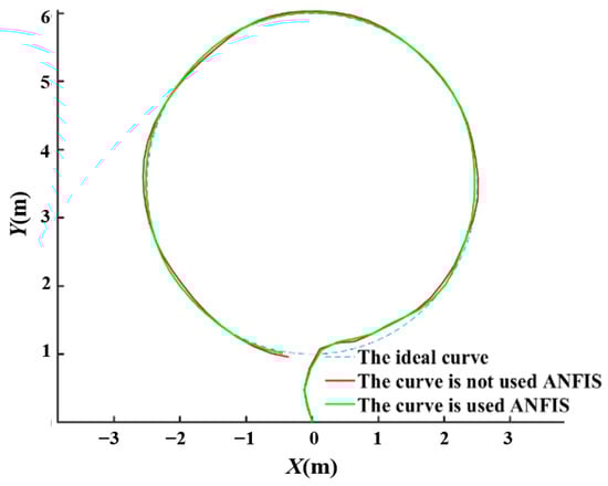 The reference trajectory of a circle was Equation (33), the initial status was , and the range of weight ratio was . The simulation comparison was conducted between a traditional MPC (the weight ratio is 25) and MPC based on ANFIS.