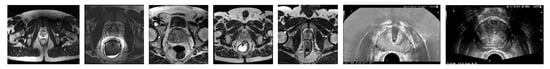 Center slice of a sample from MR and US datasets (from left to right): “Girona”, “Promise12”, “Prostate-3T”, “IVO (MR)”, “Private (MR)”, “IVO (US)” and “Private (US)”.