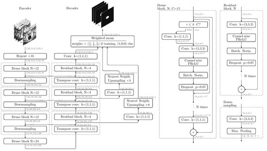 The full architecture is sufficiently described in Figure 2. Therefore, only a few interesting design choices will be discussed here. Firstly, the proposed Dense block includes a residual connection, which empirically helped the CNN converge faster. Secondly, every Dense block contains between 12 and 24 “standard” convolutions (kernel of size (3, 3, 3)), as well as several “bottleneck” convolutions (kernel of size (1, 1, 1)), for a total of 72 “standard” convolutions, which is a huge number compared to similar architectures such as V-net (with only 12 convolutions in its resnet-based encoder) or BOWDA-net [] (with 28 convolutions in its densenet-based encoder). This makes the encoder better capable of learning more complex representations of the input data. Comparatively, the decoder can have a simpler resnet architecture, since the heavy lifting (which is feature extraction) has already been done by the encoder. Thirdly, channel-wise PReLU was employed as activation function [], as it provides a slightly better performance at a negligible additional computational cost. A channel-wise PReLU function is similar to a ReLU (Rectified Linear Unit) [] function, but with a learnable slope for the negative inputs (instead of being just zero); is shared among all activations in a channel, but is different for every channel. Fourthly, transpose convolutions were used in the decoder, since they were found to provide a better performance when compared to upsampling followed by a convolution.
