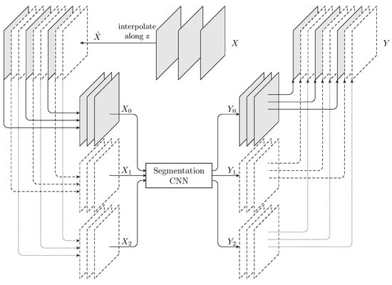 To understand how this method operates, let us describe how a threefold increase in the resolution along the z-axis would be performed (refer to Figure 4). First, the resolution of the input image X is triplicated along the z-axis (by using bicubic interpolation, for instance), therefore becoming . Then, three new images () are built by taking z-slices from in such a way that they have the same size (dimensions) and spacing (voxel size) as X, but are offset by different sub-voxel amounts along z-axis (in fact, note that ). Then, and are fed through the CNN, and three segmentation masks are obtained (). Finally, all three predictions are combined by stacking them in the correct order, hence obtaining , which is a predicted mask with three times the resolution of X along the z-axis. This same procedure could be applied to any number of dimensions simultaneously, although the inference cost would scale abruptly, as all the possible sub-voxel displacement combinations would have to be computed.