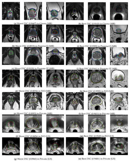 To asses these results qualitatively, in Figure 6a–n, the center 100 mm × 100 mm crop (85 mm × 85 mm in the case of US images) of three slices from the worst and best performing images (in terms of DSC) from each dataset have been represented, along with the GT (in red), the GT2 (in blue, when available) and the predicted segmentations (in green). Figures were generated using Python library plot_lib [].