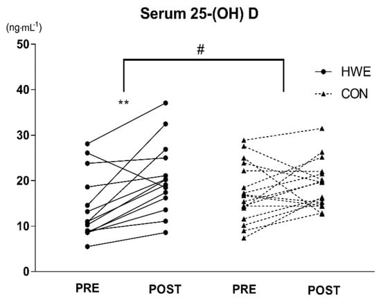 Serum 25-(OH) D before and after the four-month exercise program. For serum 25-(OH) D, statistical analyses revealed an increase between pre- and post-tests in the HWE group. HWE: high-impact weight-bearing exercise, CON: control. Significant difference between pre- and post-tests, ** p < 0.01. Significant interaction effect, # p < 0.05.