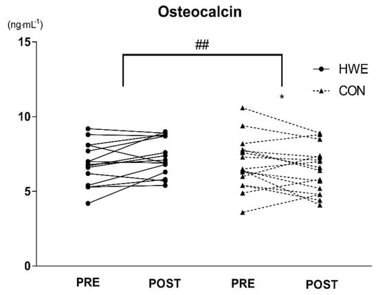 Osteocalcin before and after the four-month exercise program. For osteocalcin, statistical analyses revealed a decrease between pre- and post-tests in the CON group. HWE: high-impact weight-bearing exercise, CON: control. Significant difference between pre- and post-tests, * p < 0.05. Significant interaction effect, ## p < 0.01.
