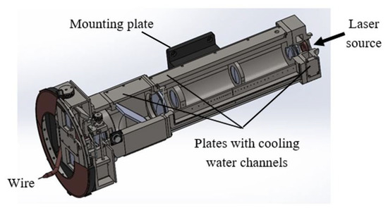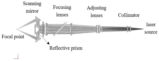 Figure 1 shows a schematic CAD drawing of the optical laser head. It integrates multiple optical and mechanical components to perform highly efficient laser beam delivery. The optical elements such as lenses and mirrors are made of fuse silica, while the materials of the mechanical components are stainless steel. In addition, the reflective prism is made of copper. The coaxial laser beam path design is given in Figure 2. A laser beam transmits through a set of designed lenses including the collimating lenses and focusing lenses. Then, the laser beam is split into two sub-beams by the reflected prism towards the two scanning side mirrors and, consequently, re-focuses the two sub-beams to the same point on the workpiece. The mechanical components were designed to house the whole laser delivery systems with high structural stiffness for operating stability and effective thermal management capability. The entire optical laser head is cooled by the internal water channels embedded in the housing structure.