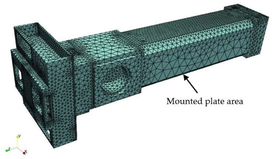 After simplifying the geometry model, a meshed model of the whole optical laser head was created in COMSOL, as shown in Figure 3. The laser-irradiated areas such as the lenses and mirrors were modelled with fine meshes (minimum element size is 10 μm), while the other zones were modelled with coarse meshes to maintain computation accuracy as well as to reduce simulation time. The whole model consists of three physics-based models: a thermal model, a structural model, and a ray-tracing optical model. The total number of the elements is about 430 k. The output and input data interfaces were implemented for the STOP analysis. In this study, the former two models were sequentially coupled and simulated in a stationary domain, while the ray tracing optics model was simulated in the time-dependent field.