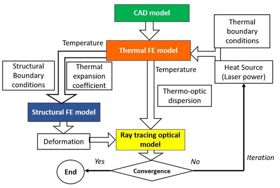 The flowchart of the STOP simulation procedure is depicted in Figure 4. Firstly, the laser beam parameters and laser power, material properties, and structural and thermal boundary conditions were defined in the geometry model. The laser heating flow on the surfaces of optical lenses was initiated as an absorbent heat source. The temperature distribution was computed by finite element method (FEM) based thermal analysis. Combined with the integrative constraints on the optical system design and housing structures, the deformations of the optical components and structural housing were calculated by FEM base structural analysis under the thermal-force coupling conditions (thermal expansion coefficient). Next, based on the temperature-dependent thermo-optic dispersion coefficient and deformed optic lens from structural analysis, the ray-tracing optical simulation model computed the optical performance such as ray paths, spot size, laser beam intensity, and deposited ray power. If the convergence criterion (self-consistent) was unsatisfying, the process with the adjusted deposited ray power went back to the heat sources. Such an iterative process was repeated until it met the convergence criterion.