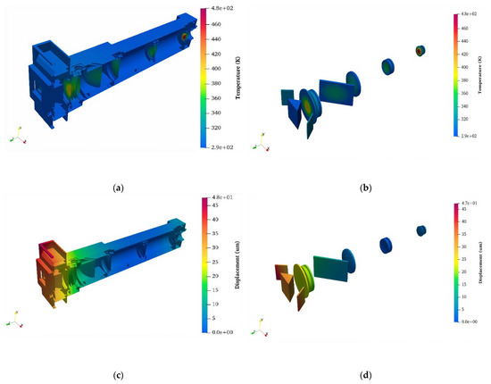 Temperature distributions by 1.634 kW in (a) housing structure and (b) lenses, and deformation distributions in (c) housing structure and (d) lenses.