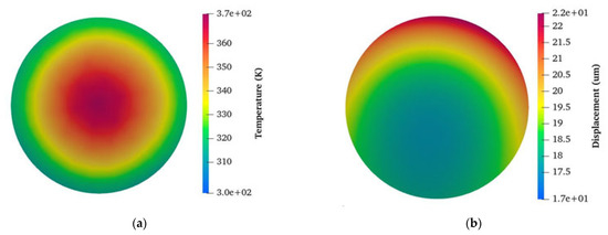 (a) Temperature and (b) displacement distributions of the focusing lens irradiated by laser power at 1.634 kW.