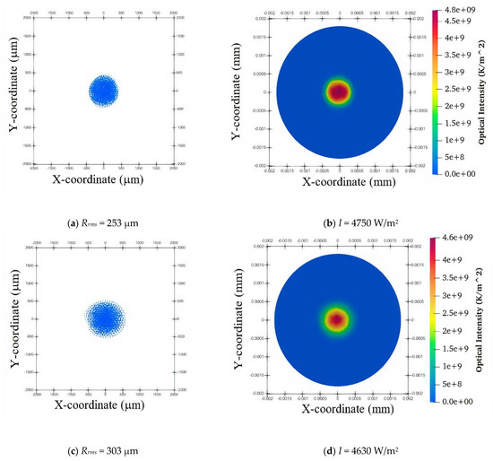 RMS spot radius (a,c) and optical intensity (b,d) by the STOP analysis (top) and ray tracing simulations (bottom).