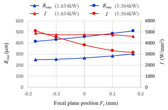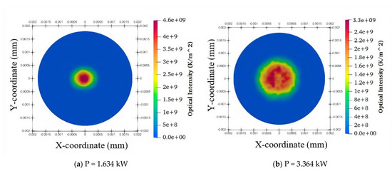 Figure 8 shows the RMS spot radius and optical intensity under 1.634 kW and 3.364 kW laser power levels as a function of the focal plane positions. From the plot, it is shown that the designed RMS spot radius at the same focal plane position is directly proportional to a rise in the laser power level. However, the optical intensity has no such linear relationship with the increasing laser power level as it is also inversely related to the squared spot radius. Figure 9 plots the RMS spot radius and optical intensity as a function of laser power at the original focal plane position (Fz = −0.1 mm). It is seen that the RMS spot radius has similar changes. However, the optical intensity may reach a peak at 2.0-kW laser power between 1.634 kW and 3.364 kW. Figure 10 shows the optical intensity distributions irradiated by 1.634 kW and 3.364 kW laser power, respectively, with the focal plane location at 0.1 mm. It is seen that different laser power levels generate different power density distributions.