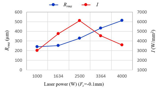where Yu represents the response characteristic of I or Rrms in the uth experiment; β0, β1, β2, β11, β22, β12, γ, δ1, and δ2 are coefficients to be estimated; xu1, xu2, and zu represent the laser power P, laser beam focus plane position Rz, and water cooling indicator h in the uth experiment, respectively; and εu is the random error. With N experiments, the response surface model in Equation (8) can be further rewritten by matrix notation: