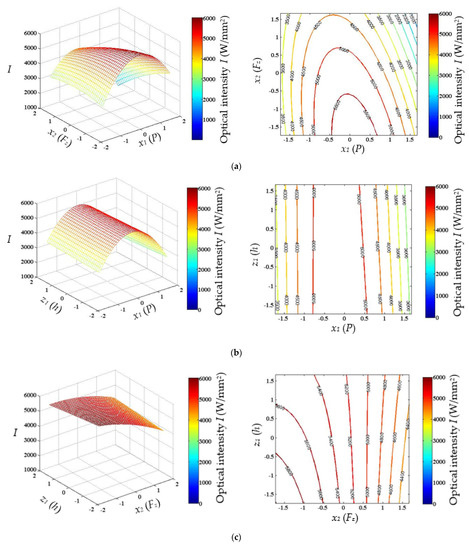 Upon the two response models, analyses of variance were performed following the procedure introduced in [12,13]. The results reveal that the two RSM models with the R-squared (R2) = 86.2% and 99% are adequate and satisfactory from the statistical point of view. They indicate that the proportion of the variance for the predicted response is represented by the input variables or variances in the regression model. The 3D response surfaces and contours of the two response models are plotted in Figure 11 and Figure 12. From the graphical representations of the regression responses models, we can clearly observe the sensitivity relationships between the responses and the input coded variables. As shown in Figure 11a, the laser power density increases with the focal plane, shifting in a negative direction and decreasing in a positive direction. A plateau laser power exists within some optimal regions. Additionally, the RMS spot radius size increases with laser power, as shown in Figure 12a,b. On the other hand, the convection coefficient at the cooling water channel plate surfaces has little influence on both optical intensity and spot radius size, which mainly depend on laser power and focal plane position.