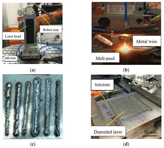 Additive manufacturing using lasers has been attracting more and more interest in both academia and industry applications for processing high-value-added components. Power-blown and wire-fed laser-aided additive manufacturing (LAAM) has shown great potential in surface modification, repair, as well as 3D printing advanced materials [17,18,19,20,21]. Compared with powder feeding, coaxial wire feeding has advantages in processing materials with low melting points [22,23,24,25,26,27,28], such as aluminum and magnesium alloys, to avoid explosions when using powders. Furthermore, the costs saved are also very attractive, as wire is much cheaper than powder.