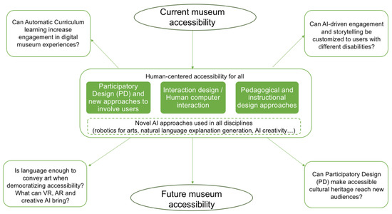 Conceptual framework for AI-enabled accessibility of museums and cultural heritage sites. Novel AI components include the concepts of learning progress in curiosity-driven exploration [11], pedagogical agents [14], creative AI, natural language explanation generation, accessible CH through explainable AI [93] and automatic curriculum learning [13].