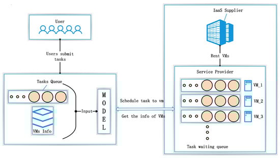 Our task scheduling system considers a common cloud computing scenario, SaaS. It includes users who submit tasks, service providers, and IaaS providers [36]. Service providers build their resource pools from VM instances rented by IaaS providers, and provide users with services through the network. Service providers receive various types of tasks submitted by end-users through the network. An efficient and flexible task scheduler that can take into account multiple goals is necessary to balance the profit of the service provider against the user experience (e.g., response time and throughput).
