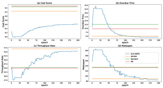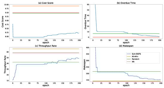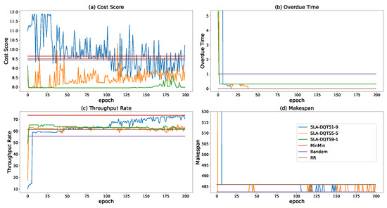 As shown in Figure 5, in a low-load environment, the overdue time can easily converge to a target range of 0 or close to 0. According to the setting of the reward function, when the overdue time is less than 1, the proportion of the return comes from throughput, cost and overdue time, and the closer to 0, the larger the proportion of the first two items. SAL-DQTS9-1 takes cost as the main reward, so the use of more low-performance machines leads to low throughput and overdue tasks. Since the overdue time is close to zero, the penalty value is too small. The return from cost reduction can offset the corresponding penalty. The remaining two items tend to be balanced and have high throughput, so their overdue time converges to 0. From the comparison of the target curves of SAL-DQTS9-1 and SAL-DQTS1-9, the weight obviously has a certain influence on the effects of different indicators. A comparison with SAL-DQTS5-5 shows that in terms of cost, the convergence trend tends to the middle, while the throughput performance is similar to that of SAL-DQTS1-9. This is because the relationship between throughput and cost is not simple. After all, the cost is also related to time. Due to marginal effects, when the throughput is close to the maximum value, the throughput increase caused by the equal cost keeps dropping. At this time, the setting of the weight can make the optimization direction biased to the side with the higher weight. Moreover, the correction parameter , in the reward functions (12) and (13) is set according to their respective maximum returns, so these two parameters constitute the upper limit of the return values under a single target similar. Moreover, the reward function curves of the two are not the same, so the weight cannot strictly make the optimization result and the weight ratio consistent. However, it is possible to modify the weight ratio to show the optimization tendency of a certain target. Through comparison, it can be seen that more balanced performance can be obtained in all aspects with a weight of 0.5–0.5. The advantage of the SAL-DQTS algorithm under low load is not obvious except in cost optimization. Min-Min will still adopt the earliest completion strategy under low load, so it will still tend to use high-performance VMs. Although the expiration time, throughput, and makespan are optimized, the cost increases accordingly. Under low load, there is no need to pursue such a high throughput rate and makespan. The appropriate sacrifice of some performance can still meet the demand and decrease the cost. Therefore, in the comparison function under low load, round robin has better overall performance.