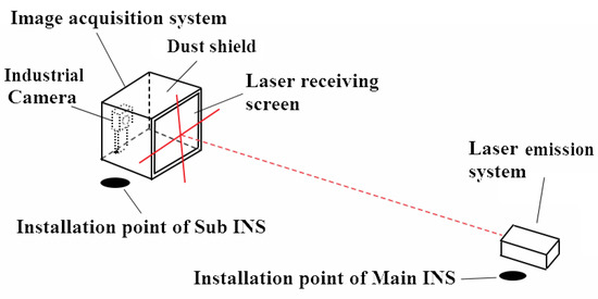 The laser emission system is composed of a cross laser and an adapter. The cross laser is composed of two line lasers with a wavelength of 635 nm. The maximum output power of the two lasers is 50 mw. The two line lasers are fixed into a cross laser by the adapter and installed near the main INS as the measuring datum.