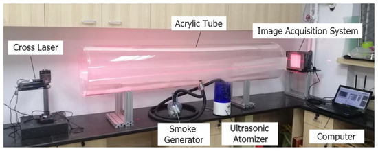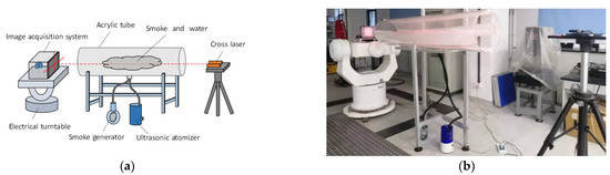 In order to verify the robustness of the algorithm to the uneven distribution of energy under the influence of smoke and water mist, this paper simulated the environmental impact of smoke and water mist as shown in Figure 3. A smoke generator and an ultrasonic atomizer were used to generate smoke and water mist, an acrylic tube was used to collect the smoke and water mist in the light path of the cross laser-pattern.